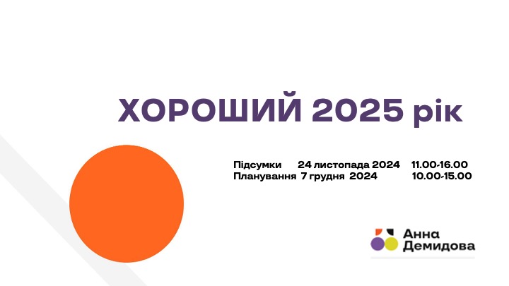 Тема року: Хороший 2025 рік У Києві жива зустріч «Підсумки 2022–2025» 24 листопада 2024 з 11:00 до 16:00 «Створення проекту Гарного 2025» 7 грудня 2024